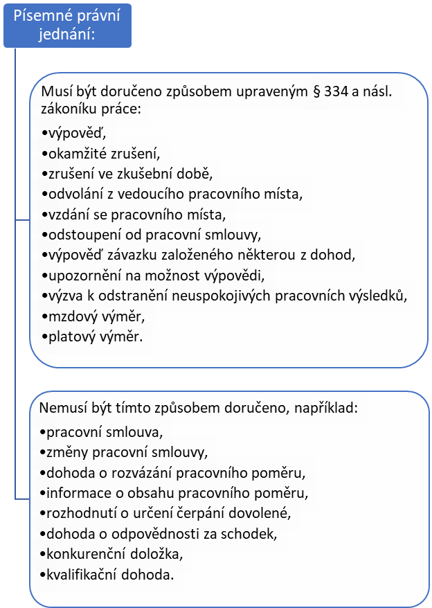 V pracovněprávních vztazích ještě musíme rozlišovat případy, kdy zákoník práce vedle zachování písemné formy vyžaduje ještě zvláštní formu doručení druhé straně. Povinnost doručení se uplatňuje zejména tam, kde musí být určitý zaměstnavatelův projev vůle doručen zaměstnanci do jeho vlastních rukou. Doručení představuje zvláštní podmínku, jež musí být splněna, aby bylo písemné právní jednání dovršeno a způsobilo zamýšlené právní následky. Pokud zákon vyžaduje doručení do vlastních rukou, musí být písemnost zaměstnanci předána některým ze zákonem stanovených způsobů. V případě sporu bude na zaměstnavateli, aby prokázal, že k doručení do vlastních rukou zaměstnance řádně došlo. Ne všechna písemná právní jednání ale musí být doručena do vlastních rukou.